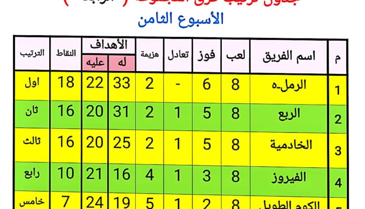 أوضح الدكتور عزت محروس وكيل وزارة الشباب والرياضة بكفر الشيخ، أن فريق “محلة دياى” تصدر المجموعة الأولى برصيد “17” نقطة وفريق “المنشأة الكبرى” تصدر المجموعة الثانية برصيد “21” نقطة وكذلك فريق “روينة” تصدر المجموعة الثالثة برصيد “24” نقطة وتصدر فريق “الرملة” المجموعة الرابعة برصيد “18” نقطة وقد عقدت لجنة المسابقات إجتماعاً لمناقشة كافة الأحداث في مباريات الأربع مجموعات واستعرضت تقارير مراقبى المباريات لإصدار القرارات الواجبة، وفق اللوائح والقوانين للعبة كرة القدم المعمول بها في الإتحاد المصري للعبة و نشرة وزارة الشباب والرياضة .