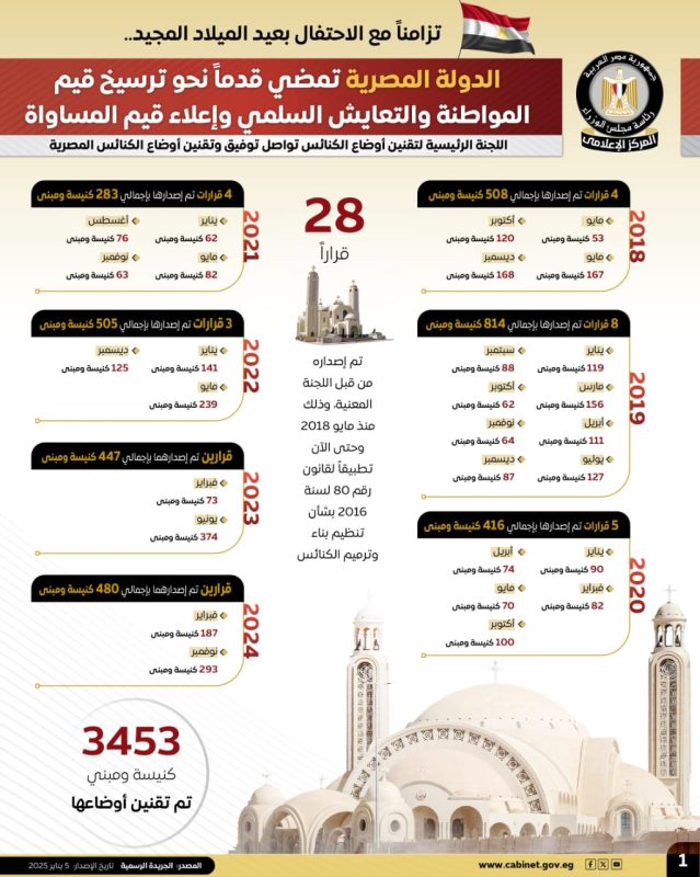 نشر المركز الإعلامي لمجلس الوزراء، تقريرا تضمن إنفوجرافات تسلط الضوء على جهود الدولة المصرية نحو ترسيخ قيم المواطنة والتعايش السلمي وإعلاء قيم المساواة وذلك تزامنًا مع الاحتفال بعيد الميلاد المجيد.