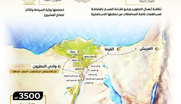 وأوضح التقرير أن المسار يمتد على طول 3500 كم ذهاباً وعودة، ويتضمن 25 نقطة، لافتاً إلى أن تكلفة أعمال التطوير ورفع كفاءة المسار بلغت 463.6 مليار جنيه، بالإضافة لمساهمات كافة المحافظات من خططها الاستثمارية، في حين خصصت وزارة السياحة والآثار 60 مليون جنيه لصالح المشروع.
