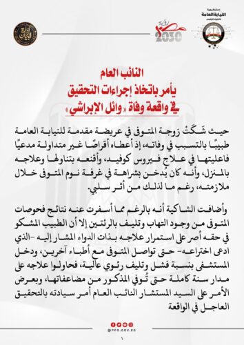 اتّهمت زوجة الاعلامى الراحل وائل الإبراشي في عريضة رفعتها للنيابة العامة طبيباً بالتسبب في وفاة مؤكّدة أنّه “أعطاه أقراصاً غير متداولة، مدعياً فاعليتها في علاج فيروس كورونا، وأقنعه بتناولها وعلاجه بالمنزل، وأنه كان يُدخّن بشراهة في غرفة نوم الإبراشي خلال ملازمته، رغم الأثر السلبي لذلك”