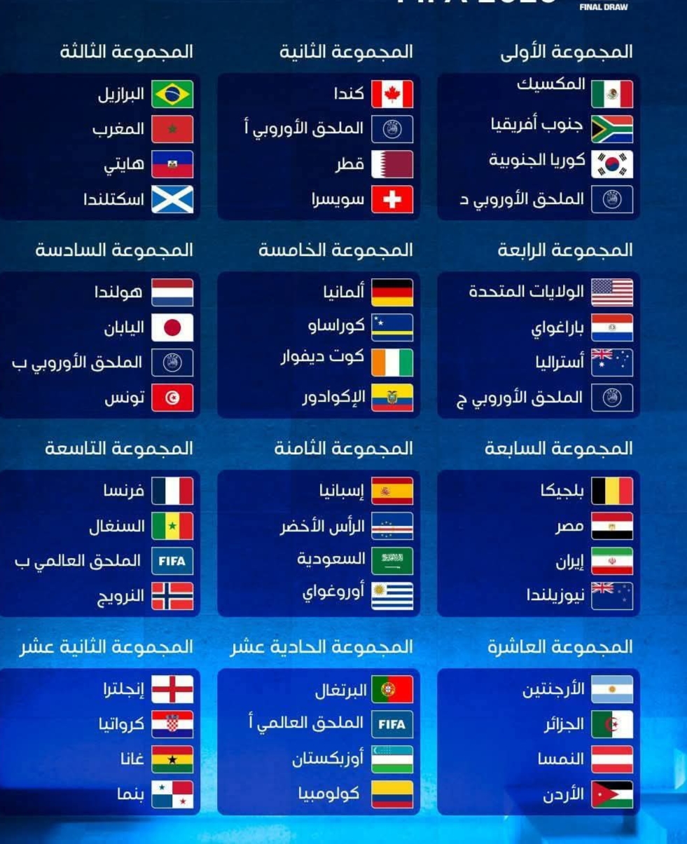 وقد أسفرت قرعة كأس العالم التي أقيمت اليوم 5 ديسمبر 2025، عن النتائج التالية: