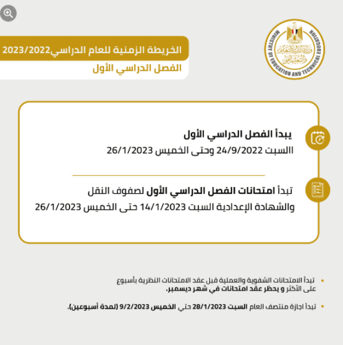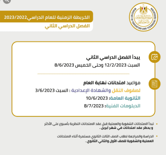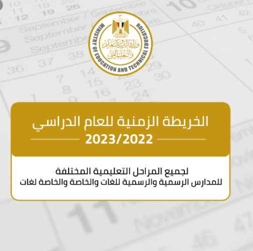 تعلن وزارة التربية والتعليم والتعليم الفني عن الخريطة الزمنية للعام الدراسي٢٠٢٢_٢٠٢٣ لجميع مراحل التعليم المختلفة للمدارس الرسمية والرسمية للغات والخاصة والخاصة للغات.
