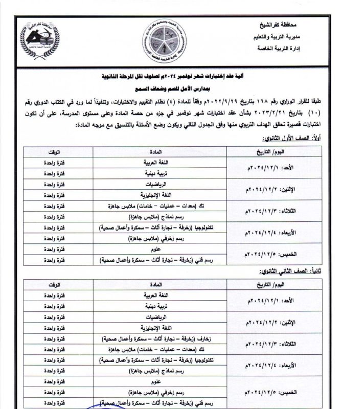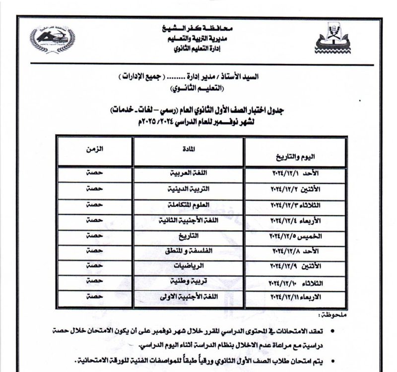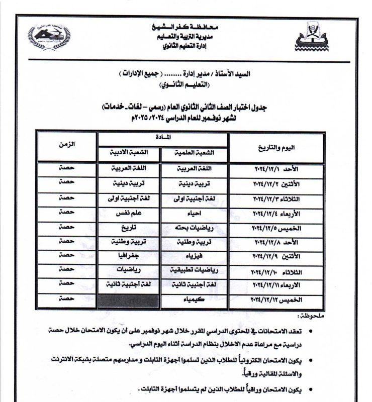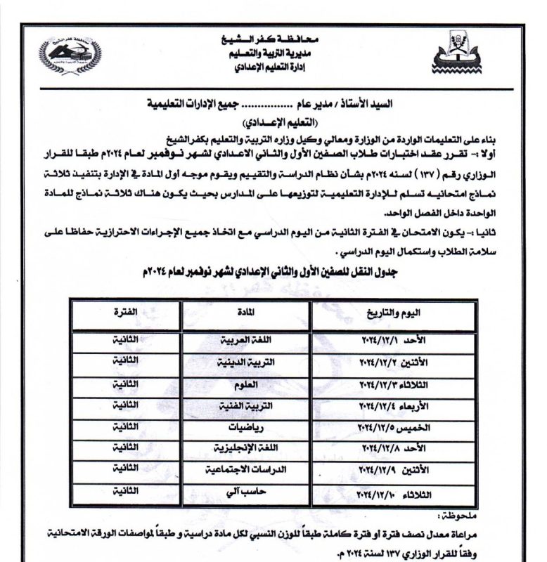 أعلنت مديرية التربية والتعليم بمحافظة كفر الشيخ، جدول امتحانات شهر نوفمبر الجاري، لصفوف النقل لكافة المراحل التعليمية، بتوجيهات اللواء الدكتور علاء عبد المعطي، محافظ كفر الشيخ، وإشراف الدكتور علاء جوده، وكيل وزارة التربية والتعليم، وغادة النحاس، مدير عام التعليم العام.