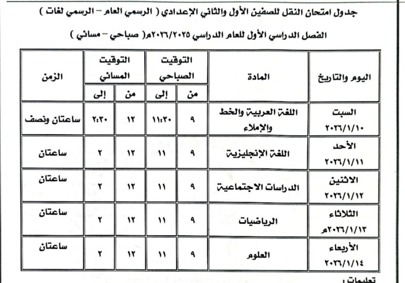 أعلنت مديرية التربية والتعليم بكفر الشيخ، بتوجيهات اللواء الدكتور علاء عبد المعطي، محافظ كفر الشيخ، وإشراف الدكتور علاء جوده، وكيل وزارة التربية والتعليم، عن جداول امتحانات الفصل الدراسي الأول للعام 2025-2026، وتبدأ الامتحانات يوم السبت الأول من يناير 2026، حتى الخميس 22 يناير 2025.