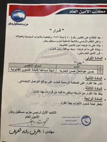 جاء ذلك القرار بعد الاطلاع على القانون رقم 40 لسنة 1977 والخاصة بالاحزاب السياسية وتعديلاته، والاطلاع على النظام السياسي واللائحة الداخلية لحزب مستقبل وطن، مع نشر هذا القرار على الصفحة الرسمية للحزب على مواقع التواصل الاجتماعي، وتنفيذه من تاريخه ويلغى ما قبله من قرارات بهذا الشأن.