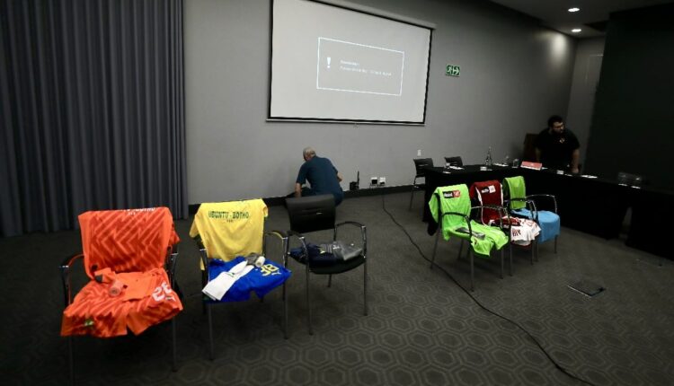 فيما يرتدي صن داونز القميص الأصفر والشورت الأزرق والجورب الأبيض فيما يرتدي الحارس الطاقم البرتقالي.
