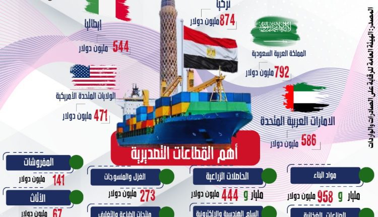 كما استعرض التقرير أهم القطاعات التصديرية التي شكلت هيكل الصادرات السلعية المصرية خلال الربع الأول من العام الجاري وتضمنت مواد البناء بقيمة مليار و958 مليون دولار، والصناعات الغذائية بقيمة مليار و546 مليون دولار والمنتجات الكيماوية والأسمدة بقيمة مليار و445 مليون دولار والحاصلات الزراعية بقيمة مليار و444 مليون دولار، والسلع الهندسية والإلكترونية بقيمة مليار و272 مليون دولار، والملابس الجاهزة بقيمة 673 مليون دولار، والغزل والمنسوجات بقيمة 273 مليون دولار، ومنتجات الطباعة والتغليف والورق والكتب والمصنفات الفنية بقيمة 244 مليون دولار، والصناعات الطبية بقيمة 156 مليون دولار، والمفروشات بقيمة 141 مليون دولار، والأثاث بقيمة 67 مليون دولار، والصناعات اليدوية بقيمة 52 مليون دولار، والجلود والأحذية والمنتجات الجلدية بقيمة 34 مليون دولار