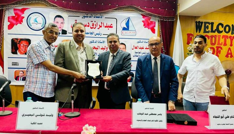 بحضور الدكتور عبد الحميد الصباغ، وكيل الكلية لشئون التعليم والطلاب، والدكتور ياسر عبد الوهاب وكيل الكلية للدراسات العليا والبحوث، رؤساء الأقسام، وأعضاء هيئة التدريس والجهاز الإداري والطلاب بالكلية.