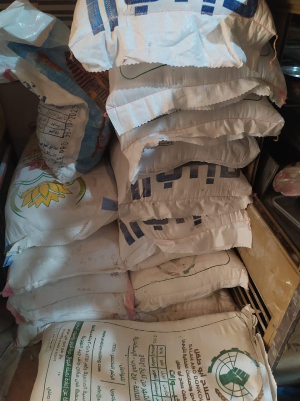 مصادرة 12 شيكارة دقيق وزن كل شيكارة 50 كجم.