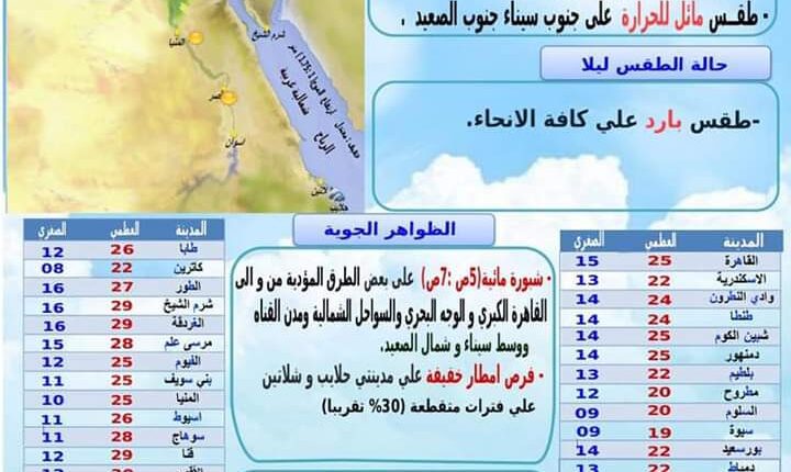 ومن المتوقع أن يكون هناك شبورة مائية في الصباح الباكر على بعض الطرق المؤدية من وإلى القاهرة الكبرى والوجه البحري والسواحل الشمالية ومدن القناة ووسط سيناء وشمال الصعيد.