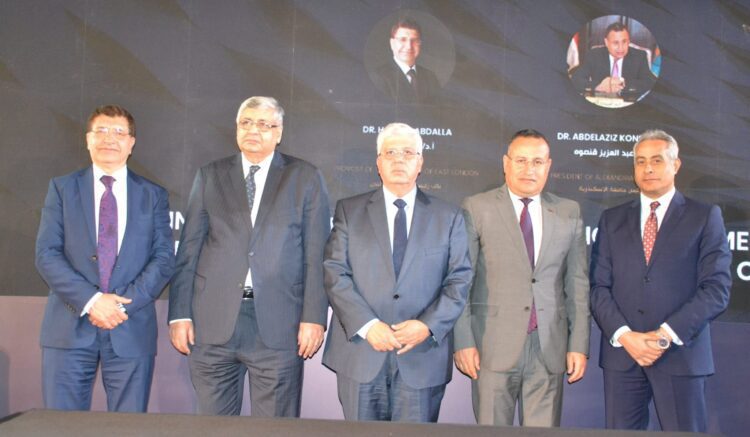 خلال فعاليات الإستراتيجية الوطنية للتعليم العالى والبحث العلمي التى عقدت أمس تحت رعاية الدكتور مصطفى مدبولي رئيس مجلس الوزراء، وحضور الدكتور أيمن عاشور وزير التعليم العالي والبحث العلمي، والسادة والوزراء ورؤساء الجامعات الحكومية والأهلية والخاصة، والسيد السفير/جاريث بايلى سفير بريطانيا بالقاهرة، وقع الدكتور عبد العزيز قنصوه رئيس جامعة الإسكندرية إتفاقية التعاون بين جامعة الإسكندرية وجامعة إيست لندن البريطانية بهدف التعاون من خلال مجموعة من الدرجات العلمية المزدوجة والدرجات المشتركة التى تدعم رؤية مصر 2030، والمرتبطة بالبرامج ذات الصلة بالصناعة وبرامج الابتكار التى من شأنها توفير فرص للطلاب فى سوق العمل، فى مجالات علوم الصحة، والرياضات، وإدارة الأعمال وريادة الأعمال، والضيافة والسياحة، القانون والعدالة، والتعاون أيضاً من خلال المشاريع البحثية المشتركة، والإشراف العلمى المشترك، وتبادل أساتذة الكلية بين الجامعتين، واستقبال أساتذة زائرين، وتبادل المواد العلمية والأكاديمية، والبث المباشر للفصول الدراسية فى التخصصات ذات الاهتمام المشترك،وتطوير برامج دراسة اللغة قصيرة المدى.