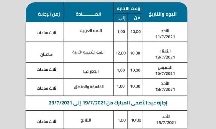 حيث تبدأ الامتحانات لشعبة العلمية يوم 10/7/2021 والمجموعةالأدبية يوم 11/7/2021 وتستكمل بقية الامتحانات بعد إجازة عيد الأضحى فتنتهي امتحانات الشعبة الأدبية 29/7/2021 وتنتهي امتحانات المجموعة العلمية 2/8/2021.
