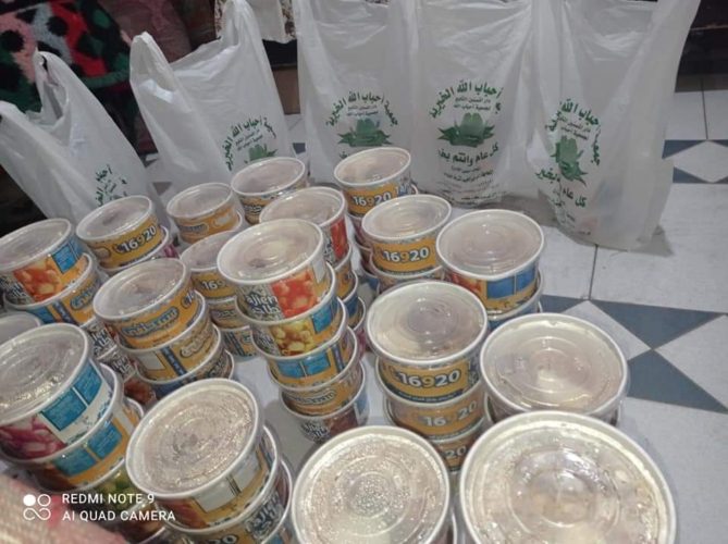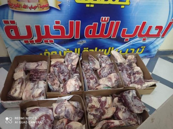 حيث قامت جمعية احباب الله الخيرية بإنشاء مطبخ خيرى ويهدف المطبخ توزيع الوجبات المشبعة على المرضى المزمنين والأيتام وعمال اليومية حيث تم توزيع ٢٥٠كما قامت الجمعية بتوزيع 300 كيلو من اللحوم على الاسر الاكثر احتياجا .