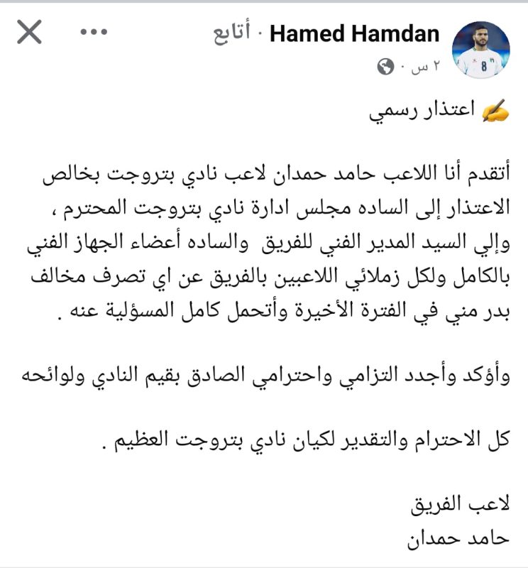وأكد حمدان تحمله الكامل للمسؤولية عما حدث، مشددًا على التزامه الكامل بقيم ولوائح نادي بتروجت، وتقديره الكبير لإدارة النادي والجهاز الفني وزملائه اللاعبين.