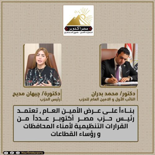 اعتمدت الدكتورة ” جيهان المديح” رئيس حزب مصر أكتوبر عدة قرارات تنظيمية خاصة بأمناء المحافظات ورؤساء القطاعات، وذلك بناءا على عرض ورؤية الدكتور ” محمد بدران ” النائب الأول لرئيس الحزب والامين العام .
