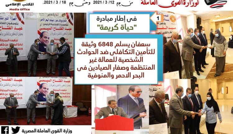 شهد حصاد الأسبوع الحالي، في وزارة القوى العاملة العديد من الأخبار المهمة – من 12  إلى 18  مارس الجاري- حيث واصل وزير القوي العاملة محمد سعفان، جولاته الميدانية للمحافظات، فقام بزيارة ، لمحافظتي البحر الأحمر والمنوفية وسلم  6848 بوليصة تأمين تكافلي ضد الحوادث الشخصية تغطى الوفاة، أو العجز الكلى المستديم أو الجزئي،  منها 2305 لصغار الصيادين ، و4543 للعمالة غير المنتظمة، وذلك في إطار مبادرة “حياة كريمة”، التي أطلقها الرئيس عبدالفتاح السيسي، للاهتمام ورعاية ومساندة العمالة غير المنتظمة لرعايتهم اجتماعيا وصحيًا و تأمينيًا ، وتنفيذ خطة كاملة لرعاية هذه الفئة  من خلال إنشاء قاعدة بيانات سليمة.