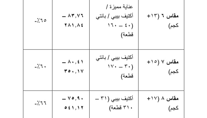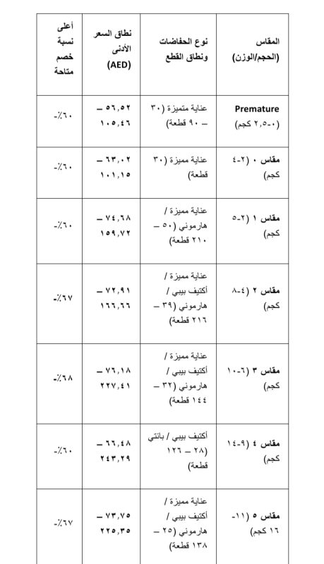 تنقسم هذه التشكيلة بشكل أساسي إلى فئتين رئيسيتين: الحفاضات التقليدية اللاصقة وحفاضات الكُلوت (البانتي)، وكلاهما متوفر بخصومات هائلة يمكنكِ الاطلاع عليها في الجدول أدناه.