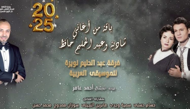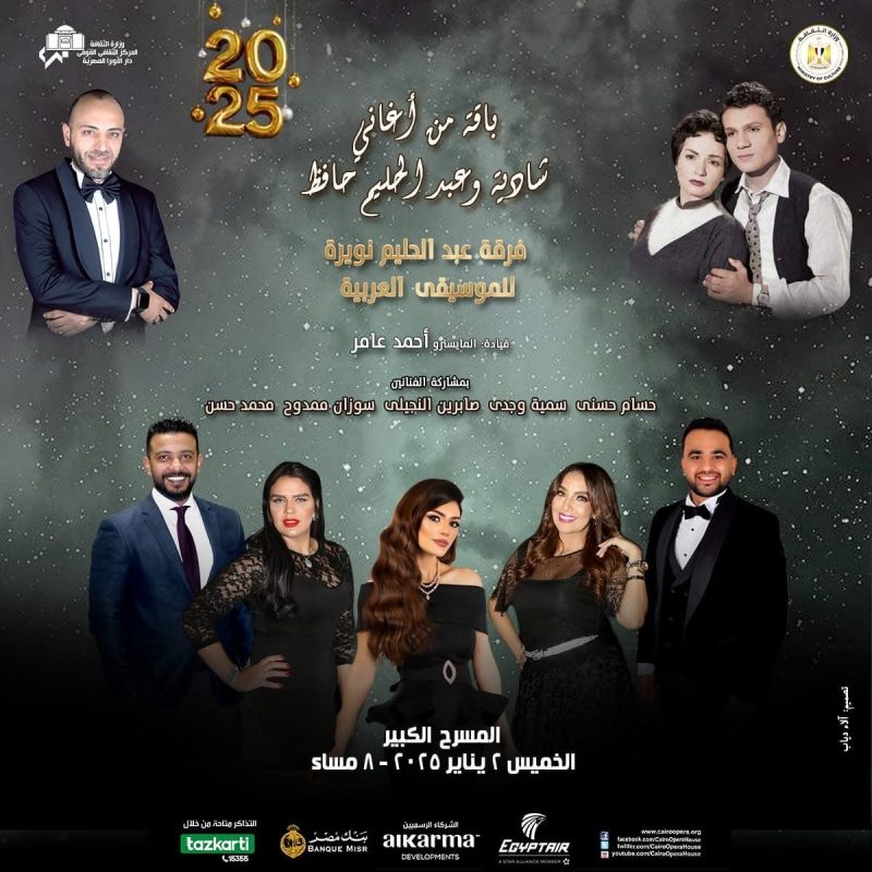 ضمن فعالياتها المقررة تقيم دار الأوبرا المصرية يوم الخميس 2 يناير 2025 حفل موسيقي بقيادة المايسترو أحمد عامر مع فرقة عبد الحليم نويرة للموسيقى العربية بمشاركة مجموعة من ألمع النجوم: حسام حسني، سمية وجدي، صابرين النجيلي، سوزان ممدوح، ومحمد حسن وباقة  من أجمل أغاني شادية و عبد الحليم حافظ وذلك على المسرح الكبير بدار الأوبرا المصرية.