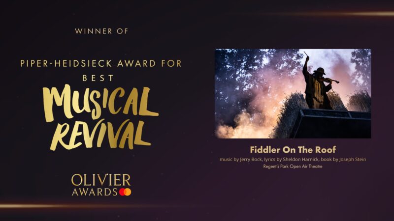 باربيكان، حصد ثلاث جوائز أوليفييه مستحقة: “أفضل إحياء لمسرحية موسيقية”، “أفضل تصميم ديكور” لتوم سكات، و”أفضل تصميم صوتي” لنيك ليدستر. بترشيحها لـ13 جائزة، ساوت “فيدلر أون ذا روف” الرقم القياسي الذي سجلته مسرحية “هاميلتون” عام 2018، مؤكدةً مكانتها كإحدى أبرز الأعمال المسرحية لهذا العام. لم تكن هذه الجوائز مجرد تكريم للعمل الفني فحسب، بل كانت دليلاً على قدرة المسرح على إعادة تقديم القصص التقليدية برؤية معاصرة تأسر القلوب.