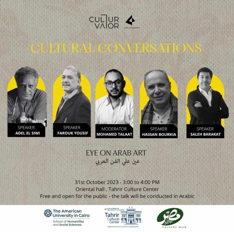 من بين هذه الفعاليات ندوة حوارية هامة تحت عنوان ” عين على الفن العربي ” يتحدث خلالها نخبة من كبار الفنانين والنقاد العرب تنعقد يوم الأحد 31 أكتوبر في تمام الساعة الثالثة عصراً بالقاعة الشرقية بمقر الجامعة الأمريكية بميدان التحرير بالقاهرة.