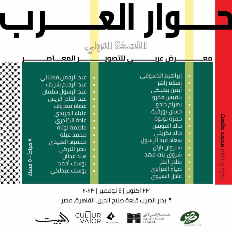 في حدث فني كبير ينظم جاليري مصر بالتعاون مع مؤسسة آرت دي ايجيبت معرضاً استثنائياً كبيراً تحت عنوان ” حوار العرب ” وذلك خلال الفترة من 23 أكتوبر وحتى 4 نوفمبر 2023 بدار الضرب بقاعة صلاح الدين الأيوبي بالقاهرة.