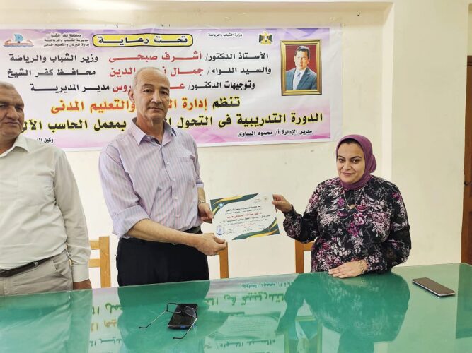 اختتمت مديرية الشباب والرياضة بكفر الشيخ، الدورة التدريبية في مجال التحول الرقمي، المنفذ من خلال إدارة البرلمان والتعليم المدني بالمديرية، لأعضاء مراكز الشباب بمشاركة عشرون عضو بمعمل الحاسب الآلي الملحق بالإدارة العامة لنظم المعلومات، والتحول الرقمي بالمديرية، وذلك برعاية الدكتور أشرف صبحى، وزير الشباب والرياضة واللواء جمال نور الدين، محافظ كفر الشيخ .