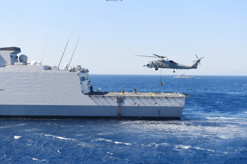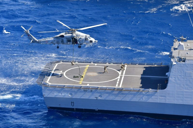 كما نفذت القوات المشاركة عدد من الأنشطة التدريبية بالبحر منها تبادل الطائرات الهليكوبتر على أسطح القطع البحرية ، فضلا عن تنفيذ أعمال حق الزيارة والتفتيش للسفن المشتبه بها , بالإضافة إلى تنفيذ أعمال الإمداد بالبحر ، وعدد من تشكيلات الإبحار والتى عكست مدى التجانس بين العناصر المشاركة وقدرتها على إتخاذ أوضاعهم بدقة وسرعة عالية .