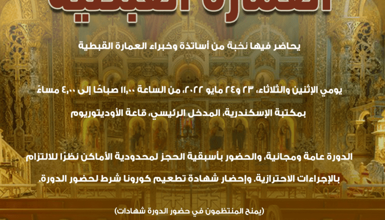 تنظم مكتبة الإسكندرية أول دورة علمية متخصصة في ” العمارة القبطية ” بالإسكندرية، وذلك يومي الاثنين والثلاثاء الموافقين ٢٣ و٢٤ مايو ٢٠٢٢، في تمام الساعة ١١.٠٠ صباحًا وحتى ٤.٠٠ مساءً بمبنى المكتبة، المدخل الرئيسي قاعة الأوديتوريوم.