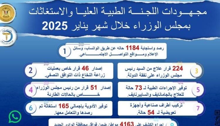 تابع الدكتور مصطفى مدبولي جهود اللجنة الطبية العليا والاستغاثات بمجلس الوزراء التي تمت على مدار شهر يناير من عام 2025, وذلك من خلال تقرير أعده الدكتور حسام المصري المستشار الطبي لرئاسة مجلس الوزراء رئيس اللجنة.