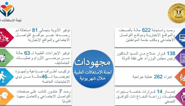 وقال الدكتور حسام المصري، بحسب ما جاء في التقرير، إن اللجنة الطبية بمجلس الوزراء نجحت خلال شهر مايو الماضي في الرصد والاستجابة لـ 622 حالة بالصحف والمواقع الإخبارية ومواقع التواصل الاجتماعي، ومكتب خدمة المواطنين، كما تمكنت اللجنة من استصدار 138 قرار علاج على نفقة الدولة من رئيس مجلس الوزراء.