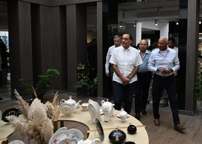 وعقب جولته بخطوط الإنتاج للمصنع التي تبلغ 15 خطا، تفقد رئيس مجلس الوزراء معرض منتجات الشركة، حيث أشاد بتنوع المنتجات ومستوى جودتها الفائق، كما تعرف على مختلف مراحل الإنتاج؛ حيث تمت الإشارة في هذا الصدد إلى أنه يتم تصنيع البورسلين عبر عدد من المراحل الإنتاجية ليخرج المنتج الأبيض، ثم يتم زخرفته، ولفت رئيس الشركة إلى أن المصنع مختص بالزخرفة لمختلف المنتجات من أدوات المائدة، موضحا أيضا أن كل مرحلة تشمل عددا من الأصول الثابتة والمعدات، ومستلزمات التشغيل التي تلزم كل مرحلة، وتتضمن الفرم، ثم الإعـداد والتحضير، ثم مرحلة التشكيل فمرحلة الصـب، وعقب ذلك تأتي مـرحلـة الـبـرس، ثم مـرحلة الشحـن والبسكـوت، مرورا بمرحلـة الجليز، ثم الفـرز، وتأتي بعد ذلك مـرحلة الـزخرفة، انتهاء بمرحلة التغليف.