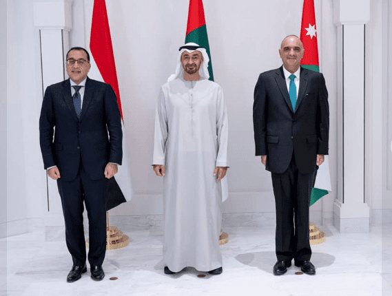 وخلال اللقاء، أعرب سمو الشيخ محمد بن زايد عن سعادته بما تم التوصل إليه من إطار متميز للتعاون بين دولة الإمارات، ومصر، والأردن، من خلال مبادرة الشراكة الصناعية التكاملية لتنميةٍ اقتصاديةٍ مستدامة، مؤكداً على الحاجة الماسة لمثل هذه المبادرات لأنه لا سبيل أمامنا إلا التكامل من أجل مواجهة ما يموج به العالم من أزمة حادة، وهو ما يستدعى تعزيز أطر التعاون والتكامل والشراكة بين دول المنطقة العربية، واستكشاف فرص وصيغ جديدة للتعاون.