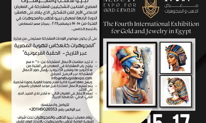 قررت إدارة معرض نبيو للذهب والمجوهرات مد فترة السماح بالمشاركة في معرض الفن التشكيلي الذي يقام على هامش المعرض لنهاية نوفمبر، لمنح الفرصة للمزيد من المشاركين لتجهيز اللوحات المناسبة لموضوع المعرض تحت عنوان ” الذهب والمجوهرات كانعكاس للهوية المصرية عبر التاريخ- حقبة الحضارة المصرية القديمة- الفرعونية-، وذلك بعد تقدم عدد كبير من الفنانين بلوحات بعضها غير ذات صلة بعنوان المعرض، الأمر الذي دفع إدارة المعرض مد فترة المشاركة بالمعرض، بناء على طلب بعض الفنانين بمنح مهلة لتجهيز لوحات مناسبة لموضوع المعرض. ويشترط في اللوحات أن تكون ذات صلة بموضوع المعرض لتعبر عن الروح المصرية القديمة في تصميم المجوهرات والحلى واستخداماتها، على أن يكون مقاس اللوحات المشاركة ١٠٠* ٧٠ سم ، ويجوز للفنان المشاركة بأكثر من لوحة بحيث يتم إرسال صورة اللوحة المشاركة عبر الايميل أو الواتس آب، وفي حالة الموافقة على اللوحة يتم تسليم اللوحات لإدارة المعرض قبل تاريخ انعقاد المعرض بأسبوع في العنوان الموضح بموقع معرض نبيو للذهب والمجوهرات على الانترنت.