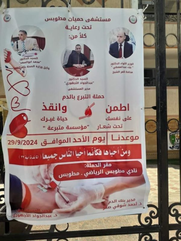 تابع اليوم الاحد ٢٩ / ٩ / ٢٠٢٤ م اللواء دكتور حاتم الهيدبي رئيس مركز ومدينة مطوبس محافظة كفرالشيخ حملة التبرع بالدم لإنقاذ إنسان بنادي مطوبس الرياضي ضمن فاعليات مبادرة بداية جديدة لبناء الإنسان.