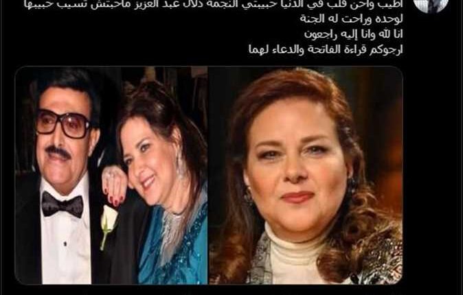 وأعلن الإعلامي رامي رضوان زوج دنيا سمير غانم، ابنة الفنانة دلال عبدالعزيز وفاتها عن عمر يناهز 61 عاما،قائلا:” عبر حسابه الشخصي على أحد مواقع التواصل الاجتماعي”فيس بوك”: «أطيب وأحن قلب في الدنيا حبيبتي النجمة دلال عبدالعزيز ماحبتش تسيب حبيبها لوحده وراحت له الجنةإنا لله وانا إليه راجعون.. أرجوكم قراءة الفاتحة والدعاء لهما».
