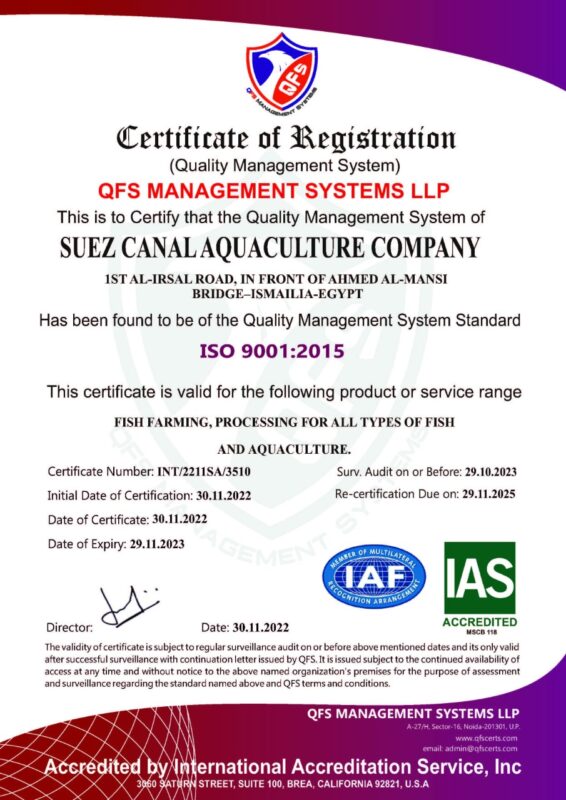 وأشاد الفريق ربيع بحصول شركة قناة السويس للاستزراع المائي، على أعلى الشهادات المعتمدة دولياً في إطار الامتثال إلى معايير السلامة الغذائية والبيئية، وتأتي هذه الخطوة تنفيذاً لتوجيهات السيد الرئيس عبد الفتاح السيسي رئيس الجهمورية بتعظيم الاستفادة من أحواض الاستزراع بالشركة على النحو الأمثل بما يحقق زيادة معدلات استزراع الأسماك بجودة عالية وبأسعار مناسبة تلبي احتياجات السوق المحلي.