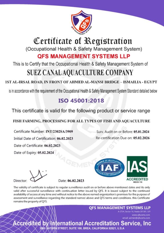 وأشاد الفريق ربيع بحصول شركة قناة السويس للاستزراع المائي، على أعلى الشهادات المعتمدة دولياً في إطار الامتثال إلى معايير السلامة الغذائية والبيئية، وتأتي هذه الخطوة تنفيذاً لتوجيهات السيد الرئيس عبد الفتاح السيسي رئيس الجهمورية بتعظيم الاستفادة من أحواض الاستزراع بالشركة على النحو الأمثل بما يحقق زيادة معدلات استزراع الأسماك بجودة عالية وبأسعار مناسبة تلبي احتياجات السوق المحلي.