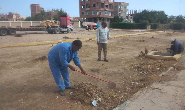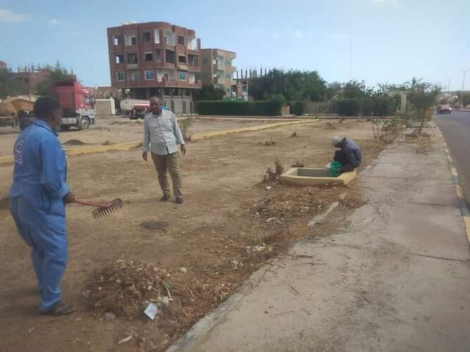 أوضح رئيس المدينة، أن عمال الزراعة قاموا بزراعة الجزيرة الوسطي بطول الشارع وتنظيفها وتقليم الأشجار بها ، كما تم رش المربعات بالمياه ورفع تراكمات الأتربة على جانبي الطريق.