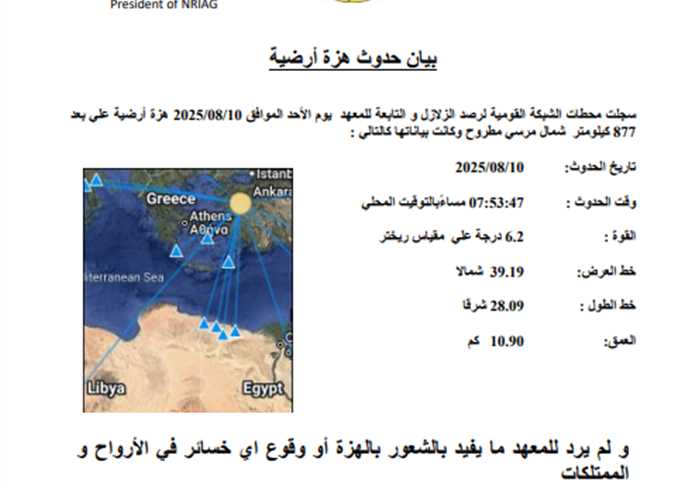 وأوضح المعهد في بيانه أن مركز الزلزال يقع على بُعد نحو 877 كيلومترًا شمال مدينة مرسى مطروح، عند خط عرض 39.19 شمالًا وخط طول 28.09 شرقًا، وعلى عمق 10.90 كيلومتر تحت سطح الأرض.