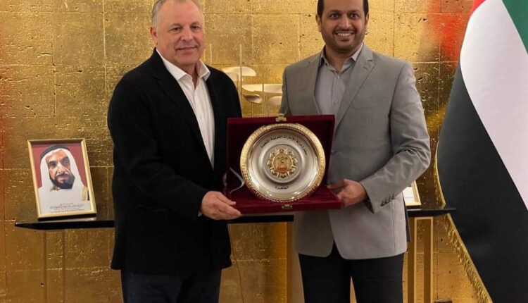 وأهدى معالي السفير، المهندس هاني أبوريدة درع سفارة الإمارات والتقطا الصور التذكارية، في حضور جميع أعضاء طاقم السفارة الإماراتية، الآنسة مريم خليفة الكعبي نائب معالي السفير، والسيد عبد الله صالح الحمادي رئيس قسم المندوبية، والسيد صالح جمعة السعدي رئيس القسم الإعلامي والثقافي.