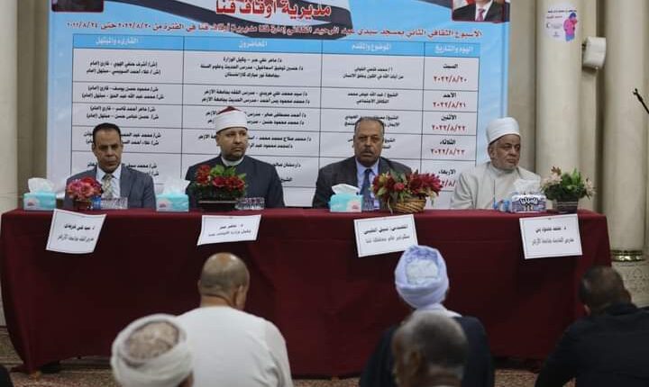 وأوضح السكرتير العام، ان فعاليات الأسبوع الثقافى الثانى لوزارة الأوقاف، تتناول القضايا المعاصرة وتصحيح المفاهيم المغلوطة لمواجهة الفكر المنحرف، على ايدى اساتذة متخصصين من جامعة الأزهر بجانب الائمة المتميزين بوزارة الأوقاف المصرية، والتى تمتد على مدار 6 أيام بصحبة قارئ للقران الكريم ومبتهل من مديرية الاوقاف بقنا، مشيرا أن ذلك يأتى فى اطار حرص الدولة المصرية ووزارة الأوقاف علي زيادة الوعى الجماهيرى والأهتمام بالعمل الدعوى والتوعوى.
