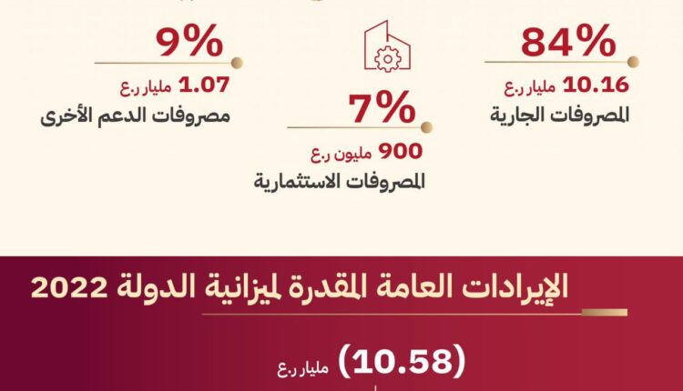 وقُدر الإنفاق في ميزانية ٢٠٢٢م بـ ١٢ مليار ريال عُماني، ٨٤٪ منها مصروفات جارية بقيمة ١٠.١٦ مليار ريال عُماني، و٧٪ مصروفات استثمارية بقيمة ٩٠٠ مليون ريال عُماني، و٩٪ مصروفات الدعم الأخرى بقيمة ١.٠٧ مليار ريال عُماني.