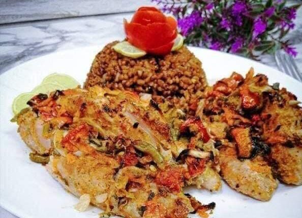 بعد مرور ساعتين مثلا نجهز الصينية و نشغل الفرن على أعلى حرارة عندنا نفرش الصينية بورق فويل ثم ورق ذبدة وندهنة بالزيت عشان ميلزقش مني السمك او نعملها في صينية تيفال او جرانيت او سيراميك نرص السمك وندهن لحمة بالمايونيز ثم نضع الخلطة بتاعة الخضار فوقية