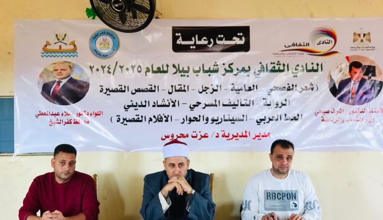 النادى الثقافي بإشراف الدكتورة نجوى صلاح رئيس الإدارة المركزية لتنمية الشباب وعلاء الدسوقي مدير عام البرامج الثقافية والفنية بالوزارة بإشراف مصطفى غريب وكيل المديرية للشباب ومتابعة صبحي عبدالعزيز مدير الإدارة العامة للشباب والدكتور فوزي حسيب مدير إدارة المشروعات بالمديرية و مصطفى الخطيب منسق النادى الثقافي وماهر أحمد المنسق بشباب بيلا.