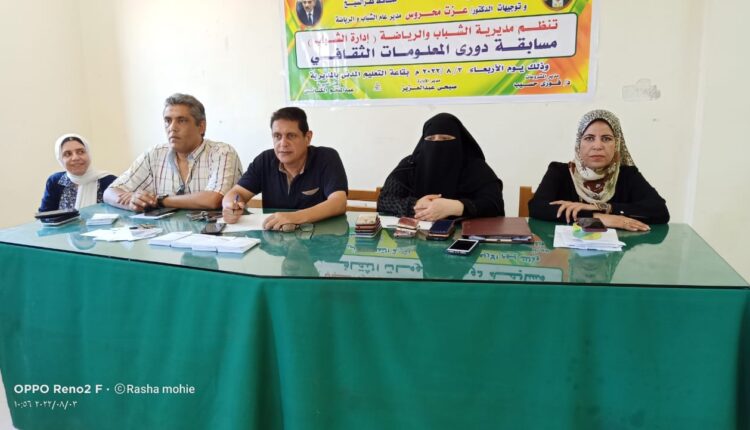 نظمت الإدارة العامة للشباب بمديرية الشباب والرياضة بمحافظة كفر الشيخ المسابقه الثقافيه فى دورى المعلومات ، والتى أقيمت بقاعة التعليم المدني بالمديرية بمشاركة 50 شاب و فتاة من ممثلي الإدارات الفرعية الفائزين في مسابقات المرحلة التمهيدية على مستوى الإدارات للتنافس في مجالات الأدب والتاريخ والجغرافيا والعلوم والرياضة والفنون، والتى جاءت برعاية اللواء جمال نورالدين، محافظ كفرالشيخ، والدكتور أشرف صبحى، وزير الشباب والرياضة، وتوجيهات الدكتور عزت محروس، وكيل وزارة الشباب والرياضة، و إشراف عبد المنعم الكنانى، وكيل المديرية للشباب.
