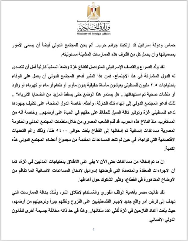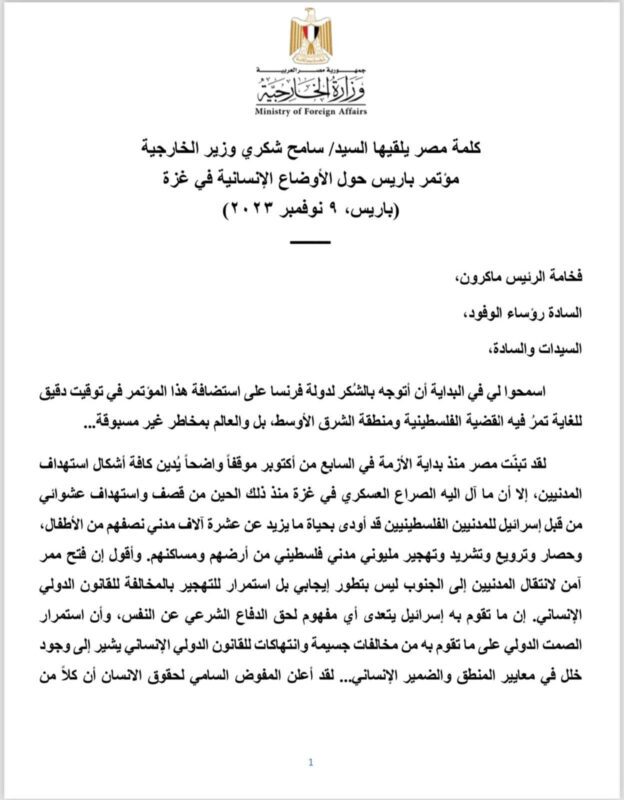 وشدد – في كلمته خلال افتتاح مؤتمر باريس حول الأوضاع الإنسانية في غزة بمشاركة 80 دولة ومنظمة دولية – على أن حماس واسرائيل ارتكبتا جرائم حرب، وأنه يجب على المجتمع الدولي تحمل احتياجات 2.5 مليون نسمة في قطاع غزة.