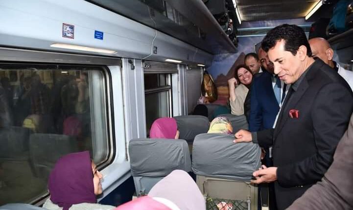 وأشاد وزير الشباب والرياضة خلال جولته داخل القطار بمجهودات العاملين بسكك حديد مصر لما لمسه من مستوى الخدمة بالقطار كما إطمأن على راحة ركاب القطار من شباب وطلبة الجامعات المصرية ،