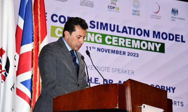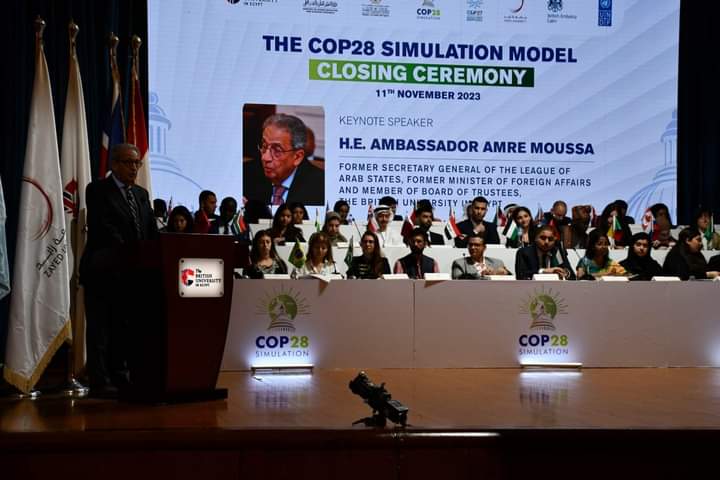 شهد الدكتور اشرف صبحي وزير الشباب والرياضة ختام فعاليات نموذج محاكاة قمة المناخ Cop28 والذي تنظمه الجامعة البريطانية في مصر برئاسة الأستاذ الدكتور محمد لطفي، وبالتعاون مع برنامج الأمم المتحدة الإنمائي وجامعة زايد بالإمارات، وتحت رعاية الرئاسة المصرية لمؤتمر أطراف اتفاقية الأمم المتحدة للتغير المناخي COP27 Presidency، ووزارة التعليم العالي والبحث العلمي، ووزارة الشباب والرياضة، والسفارة البريطانية في مصر، والأستاذ الدكتور محمود محيي الدين رائد المناخ للرئاسة المصرية لمؤتمر أطراف اتفاقية الأمم المتحدة للتغير المناخي، والذي استمر لمدة ثلاث أيام، في الفترة من 9 وحتى 11نوفمبر الجاري، بمشاركة 130 طالبًا من 32 دولة حول العالم، وذلك بحرم الجامعة بمدينة الشروق.