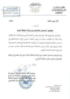 وشدد الزُبيدي على أهمية استمرار التعامل مع إدارة المنطقة الحرة لضمان سير العمل بشكل طبيعي وعدم إعاقة حركة التجارة والاستثمار ونُسخ الخطاب إلى رئيس وأعضاء مجلس القيادة الرئاسي، ودولة رئيس مجلس الوزراء، ومحافظ البنك المركزي، ومحافظ عدن وهيئة المنطقة الحرة – عدن.
