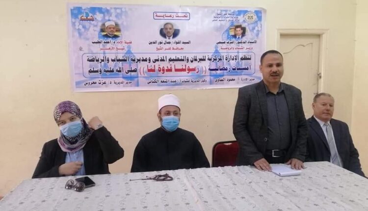 نظمت إدارة البرلمان والتعليم المدني بمديرية الشباب والرياضة بكفر الشيخ، بالتعاون مع الإدارة المركزية للبرلمان والتعليم المدني، بمركز شباب مدينة كفرالشيخ، الأمسية الرمضانية بعنوان ” رسولنا قدوتنا” بحضور الشيخ عبد الحميد متولي، عضو مركز الأزهر للفتوى الإلكترونية ، والدكتورة عواطف عبد الرؤوف ،محمد عضو مركز الأزهر للفتوى الإلكترونية، والنشء والشباب من أعضاء مراكز شباب كفر الشيخ.